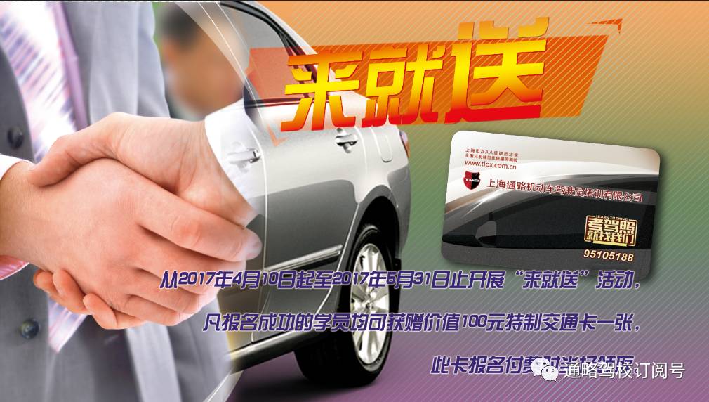 自2017年4月10日起至2017年5月31日止通略驾校开展“来就送”活动,凡报名成功的学员均可获赠价值100元特制交通卡一张,此卡报名付费时当场领取。