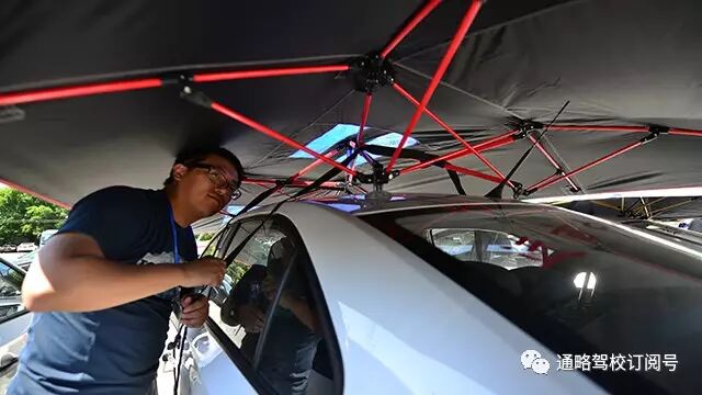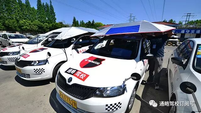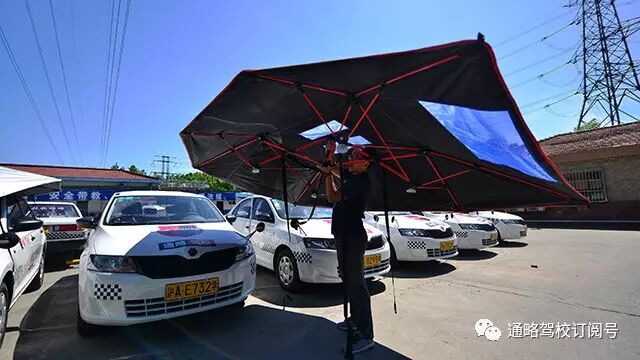 据悉,每年夏天驾校学员中暑的事件时有发生,驾校也在努力改善学员的学车环境,像这样的遮阳伞只需3分钟就可以安装完毕,可以将温度降低近20度,同时,在车辆顶部和前方都设计有网状镂空,避免遮挡视线的同时,也有利于水蒸气的蒸发。